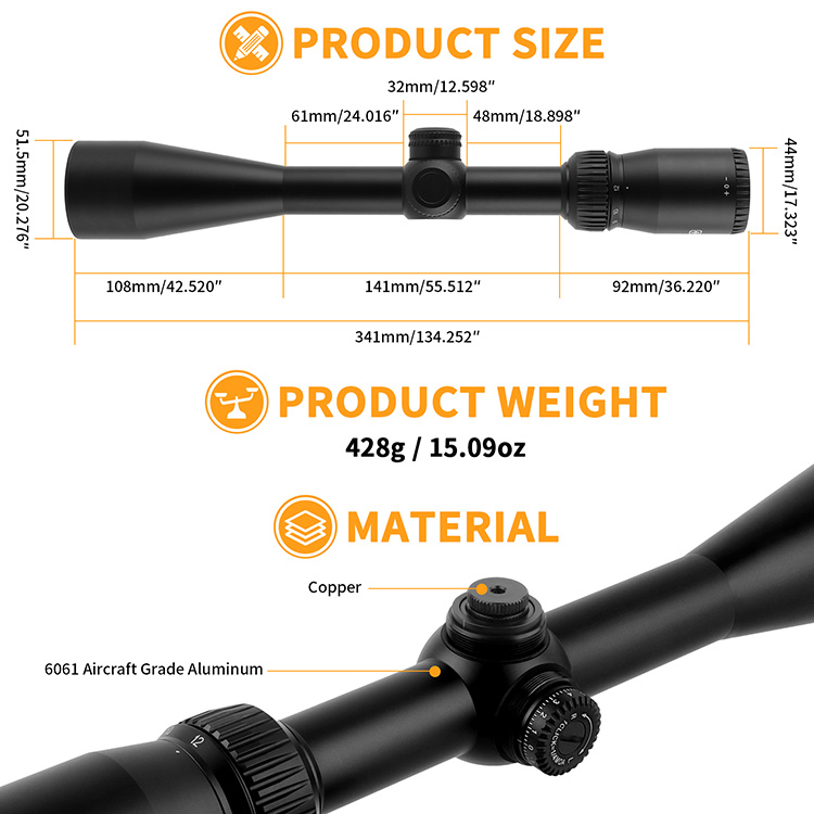 | Parallax Correction Yardage: | 100 yards | Elevation effective adjustment range: | ±80MOA |